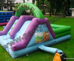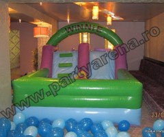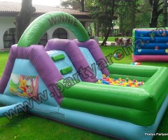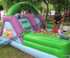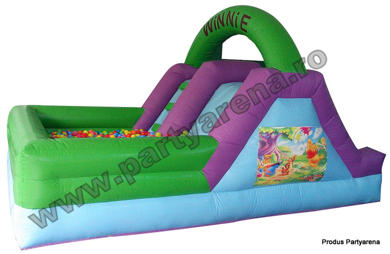 Tobogan cu piscina cu bile Winnie & friends – in acest joc gonflabil copiii mai mici gasesc motiv de bucurie si joaca printre bilele multicolore. Atragator pictat cu personaje din desenele animate cu ursuletul Winnie the Pooh si prietenii sai, ofera ca variante de distractie: saltea gonflabile, piscina cu bile multicolore, tobogan.