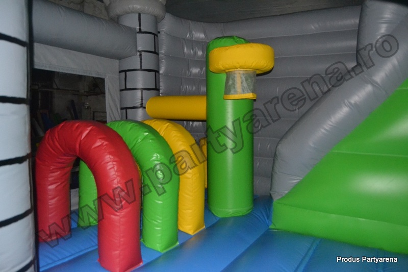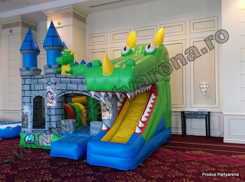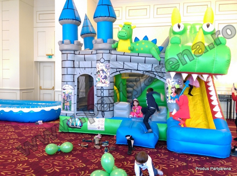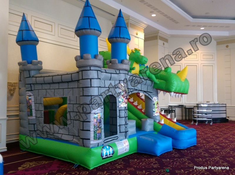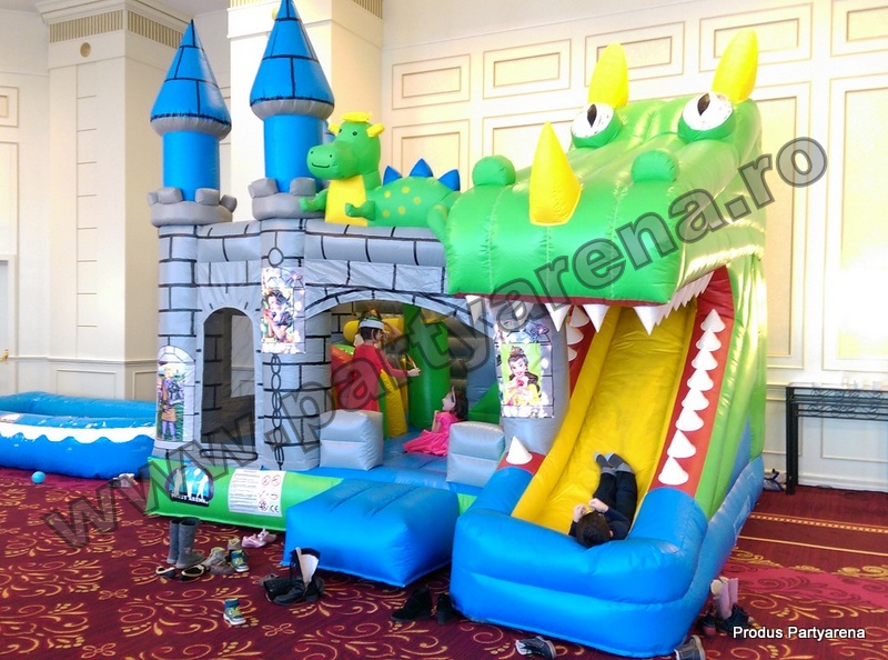 Castel cu tobogan gonflabil incorporat in forma de cap de dragon, pictat cu printese si printi, ofera ca variante de distractie: saltea gonflabila, tobogan, obstacole circulare, verticale si orizontale, cos de baschet interior. Este un joc plin de culoare, in care copii se simt plini de energie si in deplina siguranta datorita plaselor dintre turnuletele gonflabile.